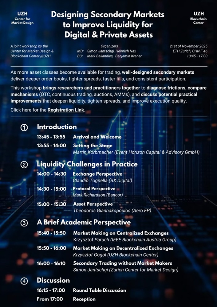 Bancor Project Lead Mark Richardson will speak at a joint workshop hosted by the Center for Market Design and the Blockchain Center at the University of Zurich on November 21. His presentation, part of the session on secondary market design for digital and private assets, will cover protocol-level perspectives on liquidity challenges.