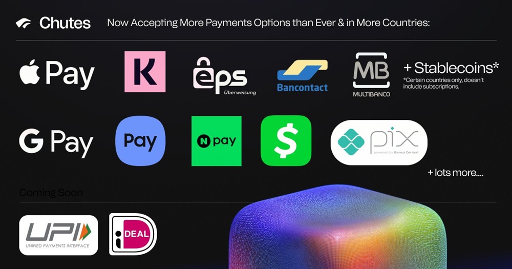 Chutes has expanded its payment options, introducing new methods for users worldwide. The update includes Apple Pay and Google Pay in additional countries, “Buy Now, Pay Later” services like Klarna, and regional providers such as Pix, Naver Pay, and Bancontact across Europe, Asia, and Latin America. The platform now also supports stablecoin payments, with more integrations planned soon.