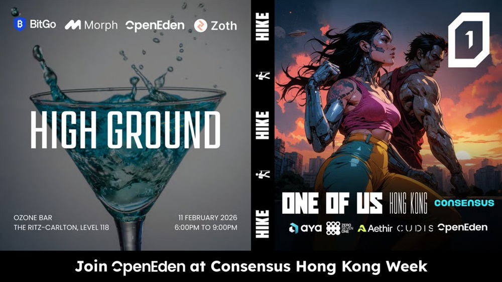 OpenEden announced that its team will be in Hong Kong during Consensus week and will host two side events for partners and community members. On February 11, the company will hold “High Ground”, an exclusive networking event co-hosted with BitGo, Morph, and Zoth. On February 13, OpenEden will organize “ONE OF US Hike & Coffee”, a community-led outdoor gathering in collaboration with AethirCloud, Theya Wallet, 071 Labs, and Cudis Wellness.