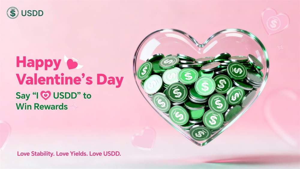 USDD has introduced a Valentine’s Day campaign running from February 9 to February 14, 2026, with 100 USDD allocated as rewards. To participate, users must follow the project’s account, repost with a themed message, and join its Telegram community. Ten winners will be selected at random to share the prize pool.