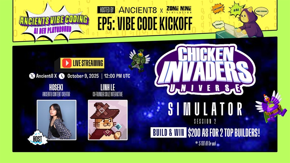 Ancient8 presentará un AMA en X el 9 de octubre a las 12:00 UTC. La sesión se centrará en mejoras, mecánicas de jefes y lógica de juego avanzada para el simulador Chicken Invaders.