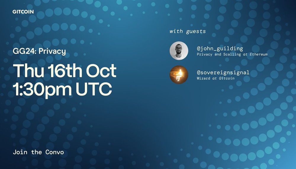 गिटकॉइन ग्रांट्स 24 के तहत, गिटकॉइन एथेरियम इकोसिस्टम में गोपनीयता पहलों पर एक केंद्रित चर्चा आयोजित करेगा। इस सत्र में यह पता लगाया जाएगा कि निजता बढ़ाने वाली तकनीकों पर काम करने वाले डेवलपर्स को फंडिंग कैसे मिलती है। वक्ताओं में जॉन गिल्डिंग (एथेरियम में गोपनीयता और स्केलिंग) और सॉवरेन सिग्नल (गिटकॉइन विज़ार्ड) शामिल हैं। यह कार्यक्रम 16 अक्टूबर को दोपहर 1:30 UTC पर X स्पेसेस के माध्यम से आयोजित होगा।