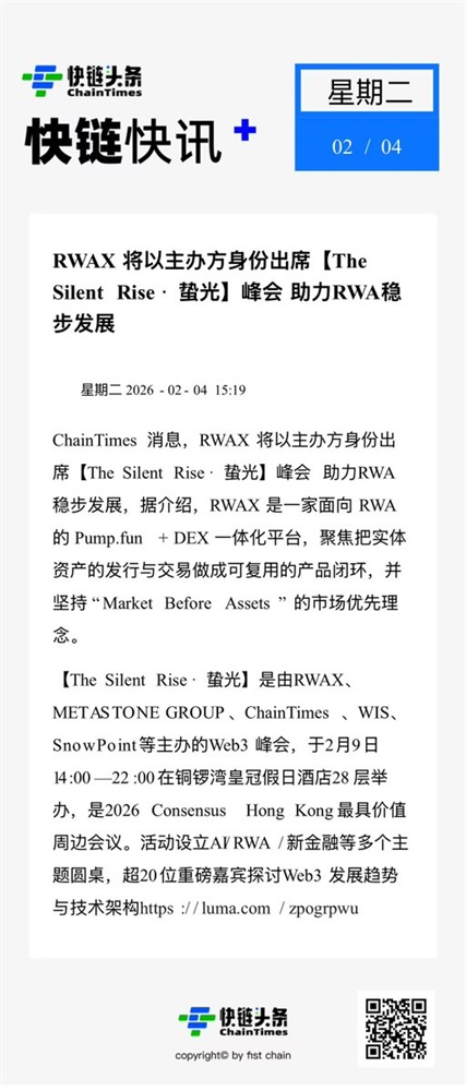 WorldAssets는 2월 9일 06:00부터 14:00(UTC)까지 Consensus HK 2026의 부대 행사로 “The Silent Rise · 蛰光”을 공동 주최합니다. 이번 행사에서는 인공지능, 실물 자산 및 신금융에 대한 내용을 다룰 예정입니다.