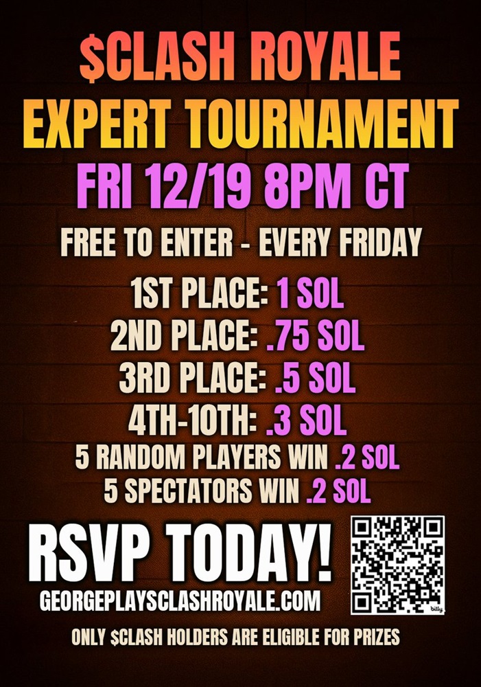 GeorgePlaysClashRoyale проведет турнир экспертного уровня, который начнется 20 декабря в 02:00 по UTC. Призы будут распределены в токенах SOL, где чемпион получит 1 SOL, второе место — 0.75 SOL, третье место — 0.5 SOL, а участники, занявшие с четвертого по десятое место, получат по 0.3 SOL каждый. Кроме того, пять случайно выбранных участников и пять зрителей получат по 0.2 SOL каждый.