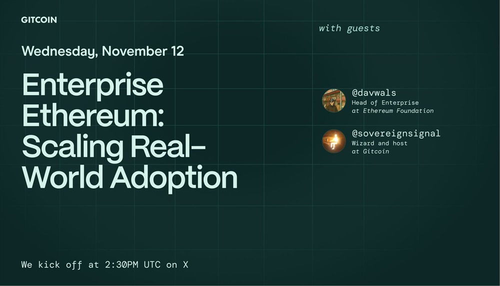 Gitcoin проведет сессию вопросов и ответов в Х с Дэвидом Уолсом, руководителем отдела корпоративных решений Ethereum Foundation. Мероприятие состоится 12 ноября в 14:30 по UTC. Цель встречи — обсудить, как корпорации используют Ethereum в реальном мире. Дэвид Уолс поделится историями о реальном применении, расскажет о текущих трудностях, развенчает мифы и расскажет о том, что ждет Ethereum в будущем.