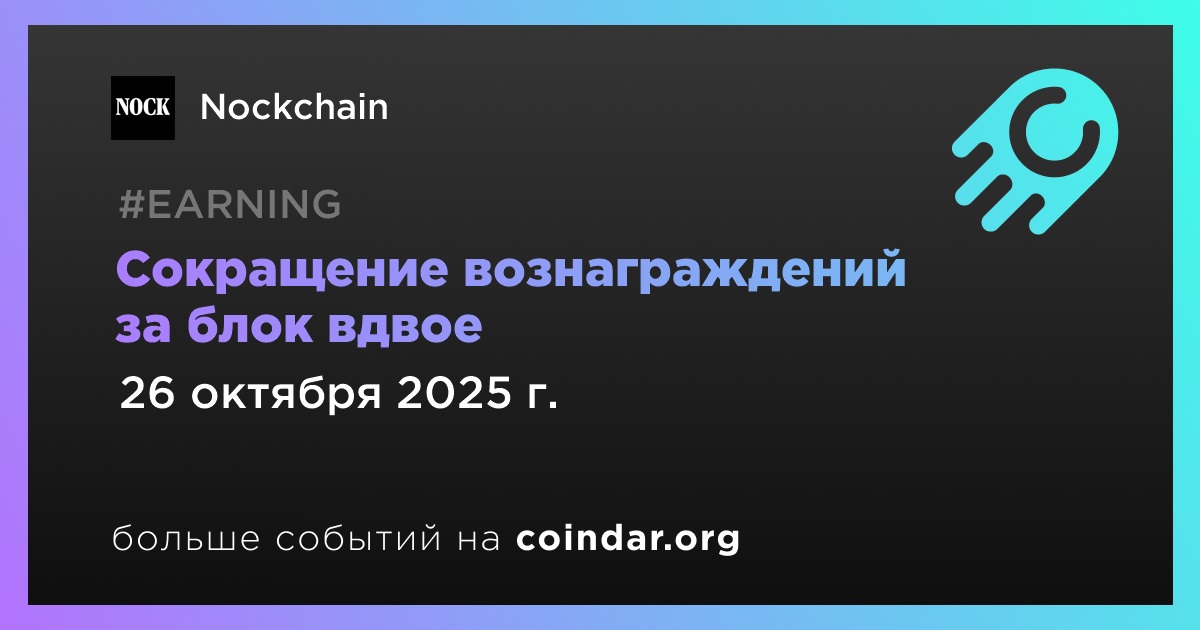 Nockchain объявила о сокращении вознаграждений за блок вдвое, которое состоится 26 октября. В этот день размер вознаграждения за блок уменьшится на 50% после достижения заранее определенной высоты блока.