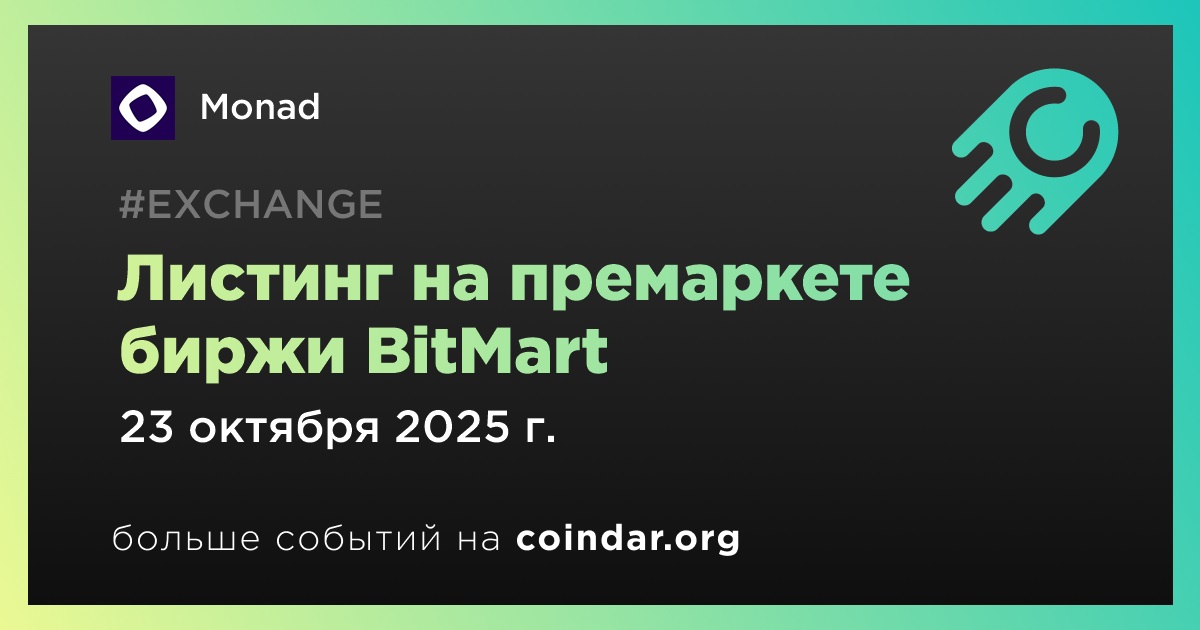 На премаркете биржи BitMart состоится листинг Monad (MON) в рамках торговой пары MON/USDT 23 октября.