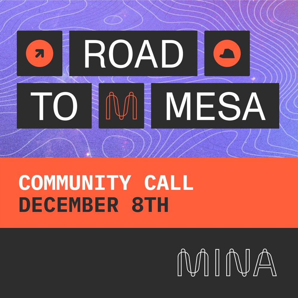Mina Protocol sẽ tổ chức một buổi gặp mặt trực tuyến về nâng cấp Mesa vào lúc 16:00 UTC ngày 8 tháng 12. Buổi gặp mặt sẽ trình bày về tình hình hiện tại của bản nâng cấp, chi tiết về đợt bỏ phiếu trực tuyến sắp tới và các cột mốc phát triển tiếp theo.