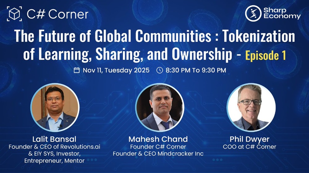 Các chuyên gia trong ngành Lalit Bansal (Revolutions.ai), Mahesh Chand (C# Corner, Mindcracker Inc) và Phil Dwyer (C# Corner) sẽ thảo luận về cách mã hóa đang định hình lại việc học, cộng tác và quyền sở hữu kỹ thuật số trong kỷ nguyên Web3.