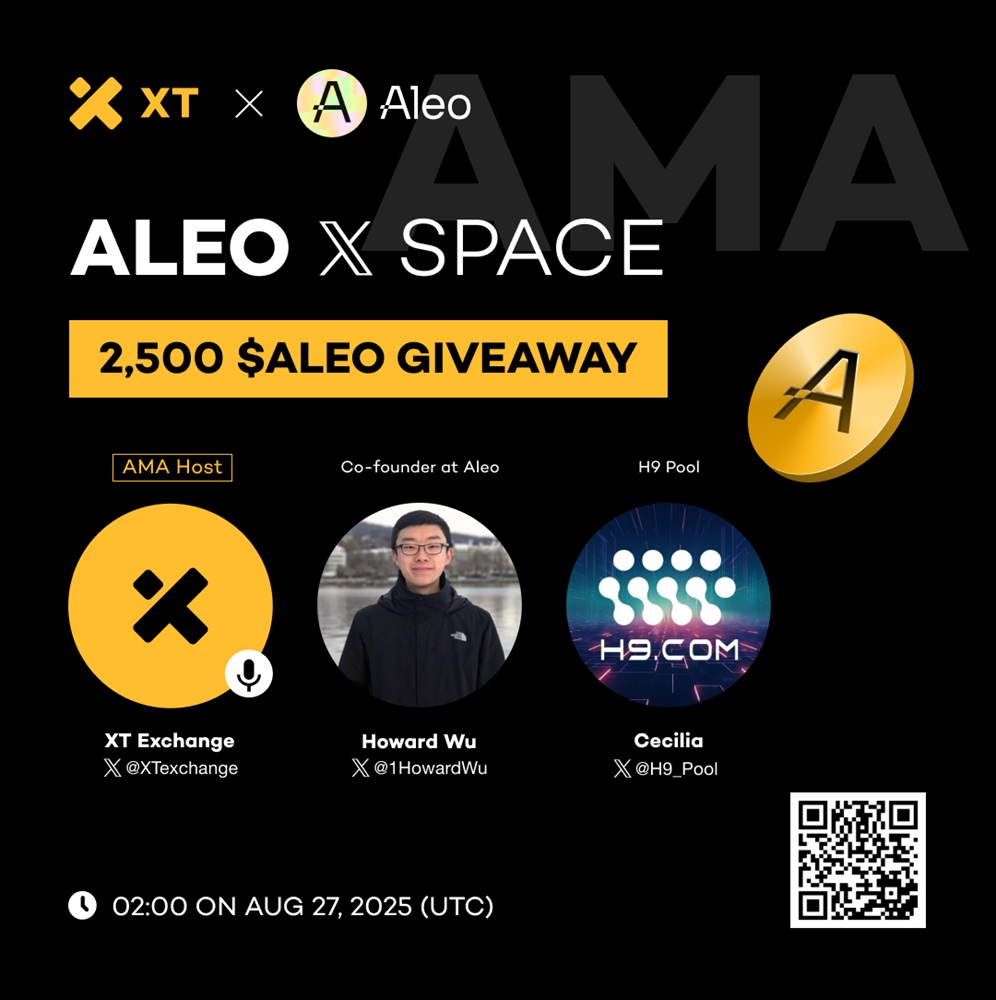 XT.COM is set to host an AMA on X with ALEO on August 27 at 02:00 UTC. The event will feature Aleo co-founder Howard Wu. Participants can join the ALEO giveaway by following XT and Aleo, reposting the announcement with hashtags, tagging friends, and submitting questions via the XT platform.