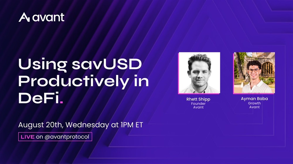 Avant USD will hold an AMA on X featuring its CEO, Rhett Shipp. The focus of the discussion will be on how to maximize yields on savUSD within the DeFi space. The event will take place on August 20th at 17:00 UTC.