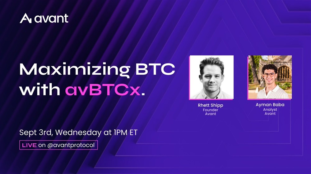 Avant USD will hold an AMA on X on September 3 at 17:00 UTC with CEO Rhett Shipp. The discussion will examine how the new avBTCx instrument is intended to enhance savBTC yields and outline the associated junior tranche risk mechanics.