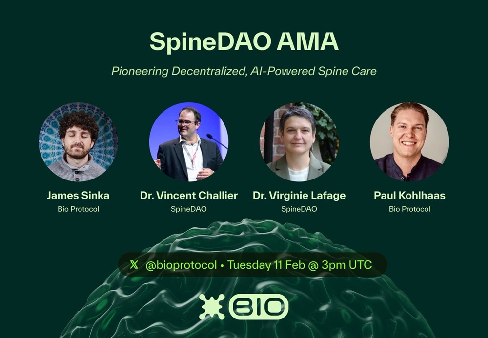 Bio Protocol will have an AMA on X with SpineDAO on February 11th at 15:00 UTC. SpineDAO, a team led by renowned surgeons, is developing innovative models for decentralized spine care using AI agents trained on medical and research data, IP tokenization, and incentivized data contributions with SPINE.