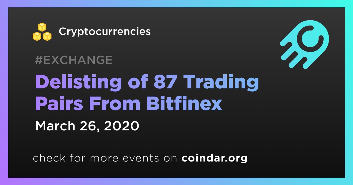 Bitfinex will remove 87 trading pairs, commencing on 26/03/2020, to optimize the trading experience for our user base.