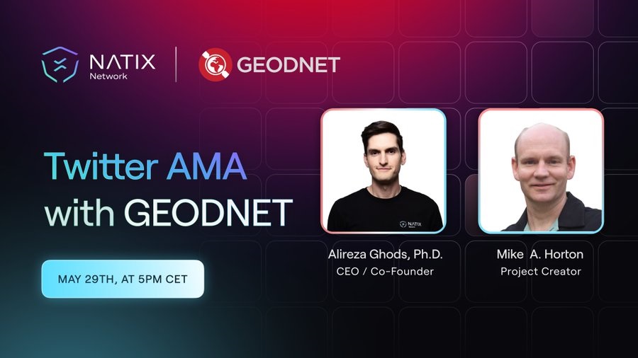 Geodnet will host an AMA on X on May 29th at 15:00 UTC. The event will feature Alireza Ghods, the CEO of NATIX Network, and Mike Horton, the founder of Geodnet.