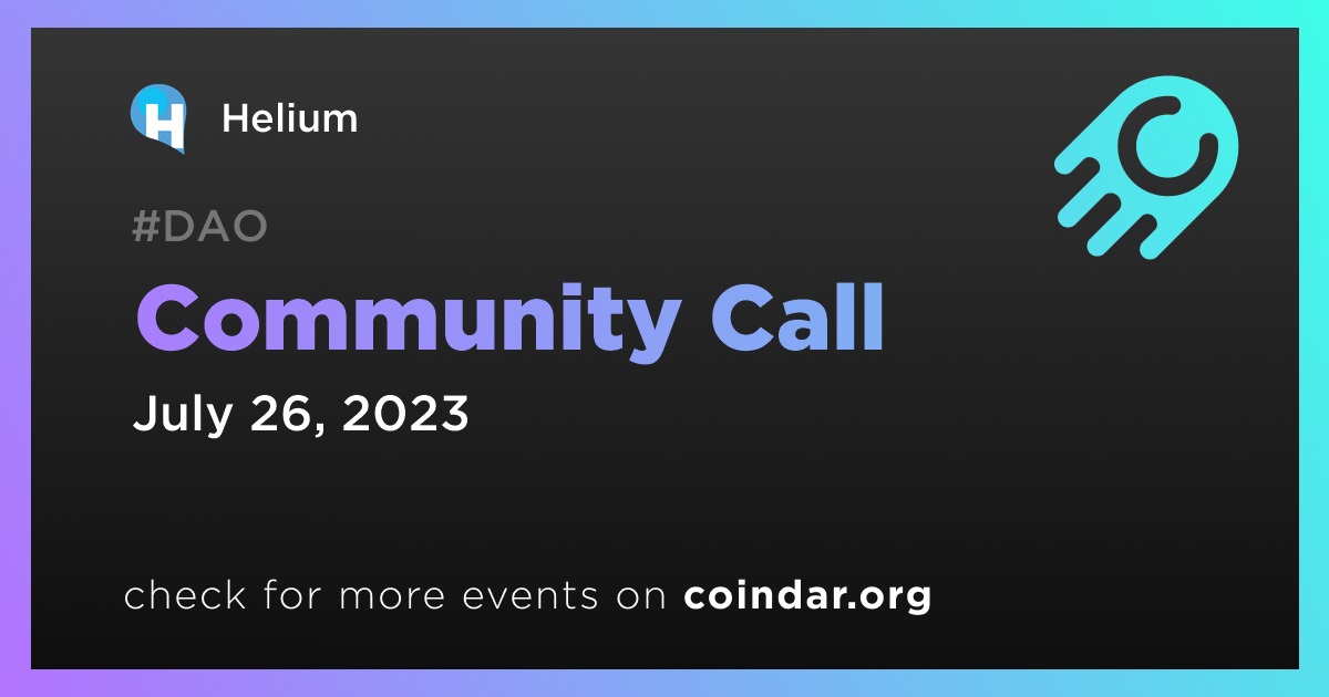 Helium will hold a community call on July 26, 16:00 UTC. The meeting will provide updates on the latest Helium Improvement Proposals (HIPs), insights into the network, and important announcements.