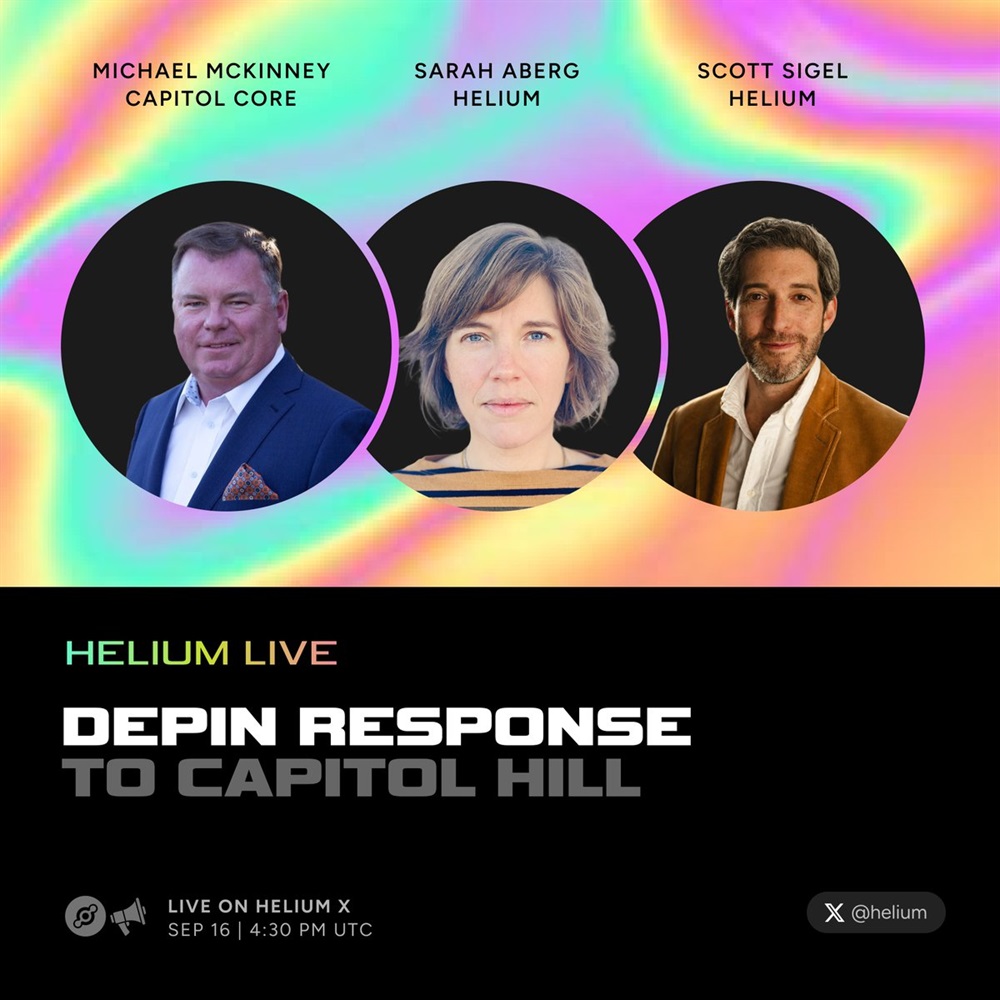 Helium will hold an AMA on X to explore how decentralized physical infrastructure networks (DePIN) fit into U.S. crypto market structure legislation. The session will be on September 16th at 16:30 UTC.