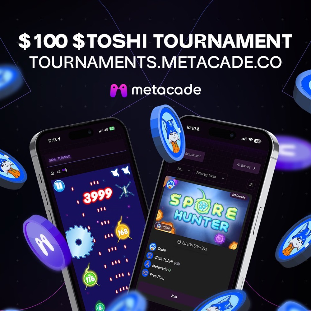 Metacade announces a free-to-play Play-to-Earn (P2E) tournament with a prize pool exceeding $100 in TOSHI tokens, celebrating TOSHI’s recent listings on Bybit and Coinbase exchanges. Players have the opportunity to win TOSHI tokens by securing a position in the top 20.