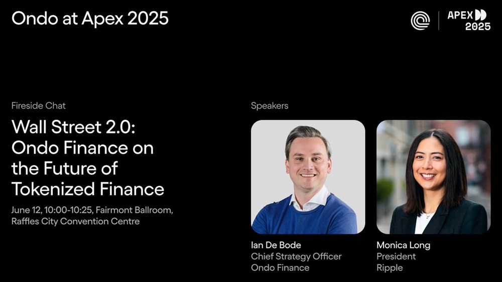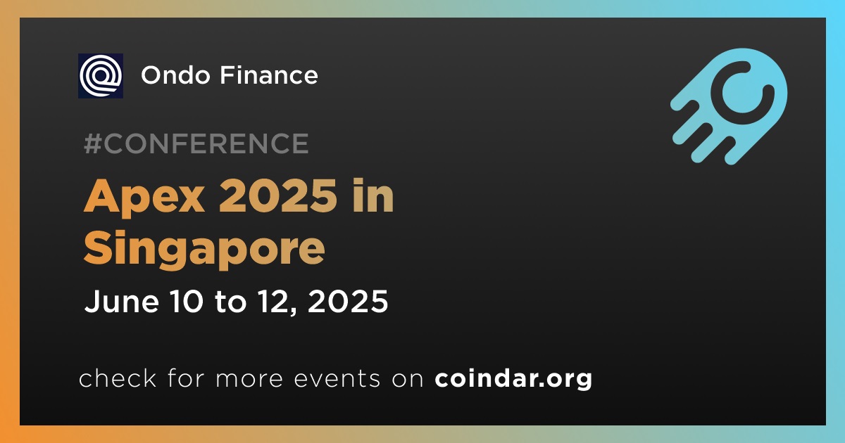 Ondo Finance will be represented by chief strategy officer Ian De Bode and APAC sales director Rania Rahardja at the Apex 2025 conference in Singapore on June 10th-12th. The meeting is positioned to convene stakeholders for discussions on current developments in the digital-asset market.