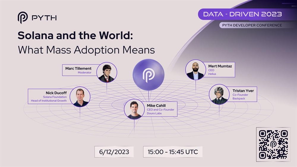 Pyth Network is set to host a discussion featuring Douro Labs, Solana Foundation, Backpack, and Helius. The discussion will revolve around the mass adoption of Web3 and what it will look like in the future. The topics to be covered include the institutional adoption of DeFi and the future of the Solana ecosystem. The event is scheduled to take place on December 6th at 15:00 UTC.