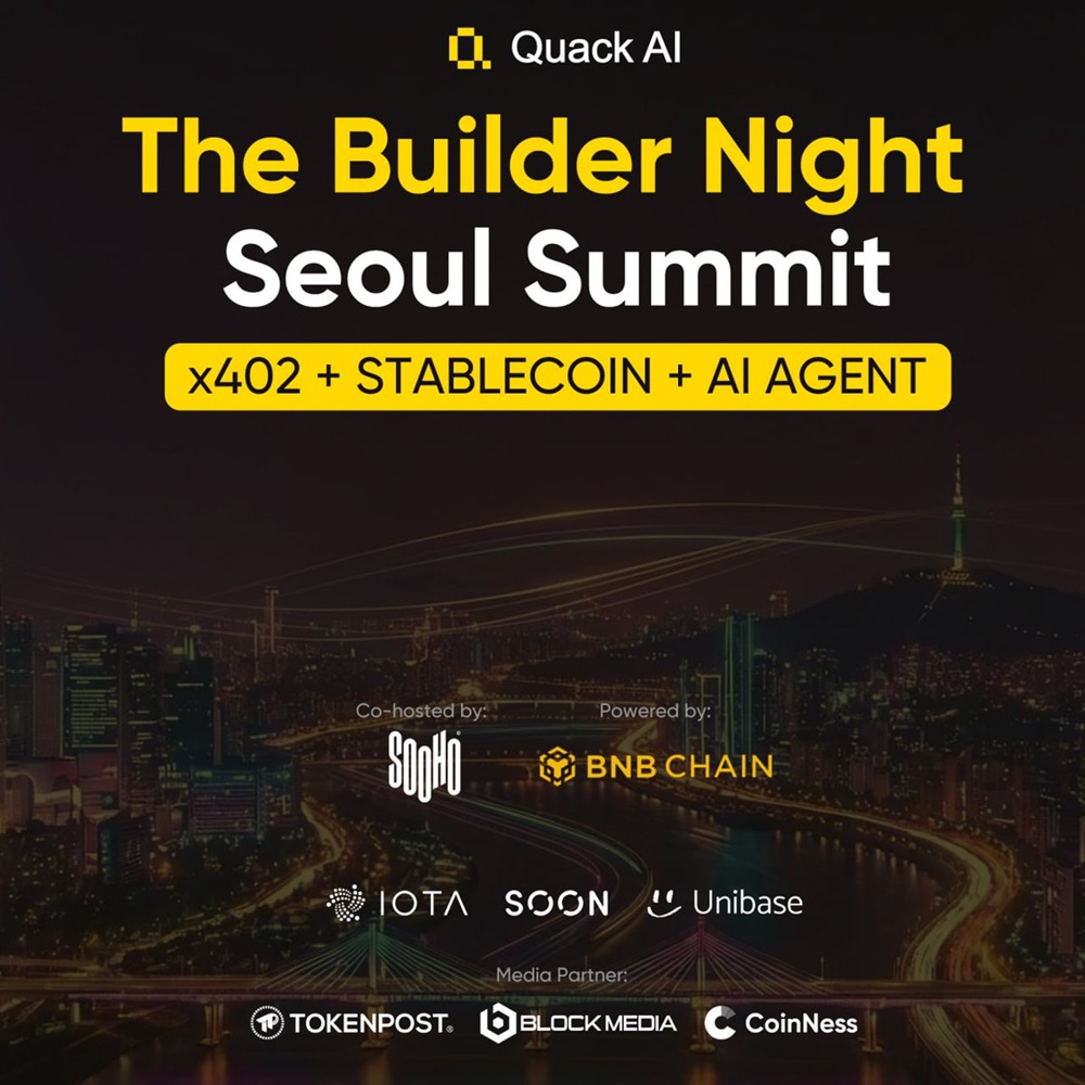 Quack AI will hold “The Builder Night | Seoul Summit” on December 22 in Gangnam, Seoul. The off-the-record gathering is aimed at builders and ecosystem teams operating at the convergence of artificial intelligence, Web3 and stablecoins.