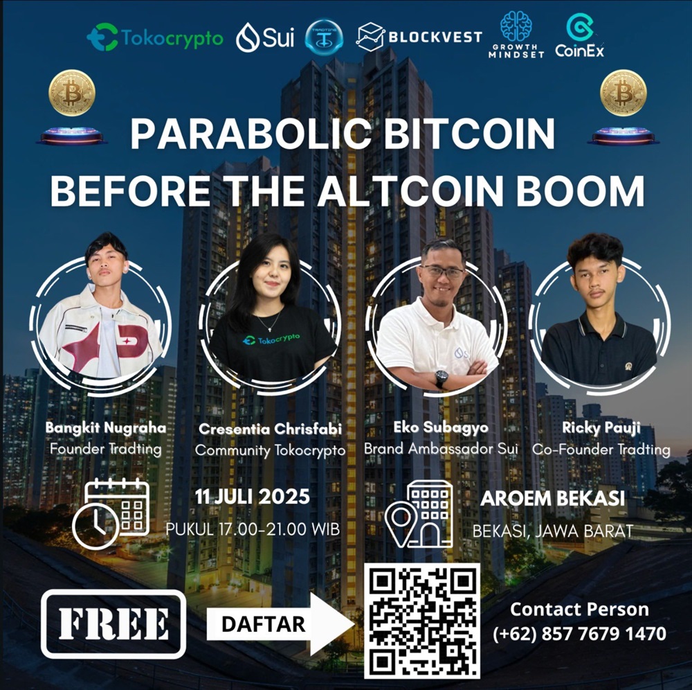 Sui Community Meetup Bekasi will take place on July 11th in Bekasi, from 10:00 to 14:00 UTC. The agenda includes discussions on Bitcoin’s prospective parabolic movement and the timing of the next altcoin cycle.