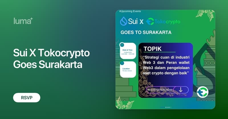 Sui will hold a meetup in collaboration with Tokocrypto in Surakarta on March 15th. The event is scheduled to begin at 08:00 UTC and will feature updates, insights, rewards, and special merchandise.