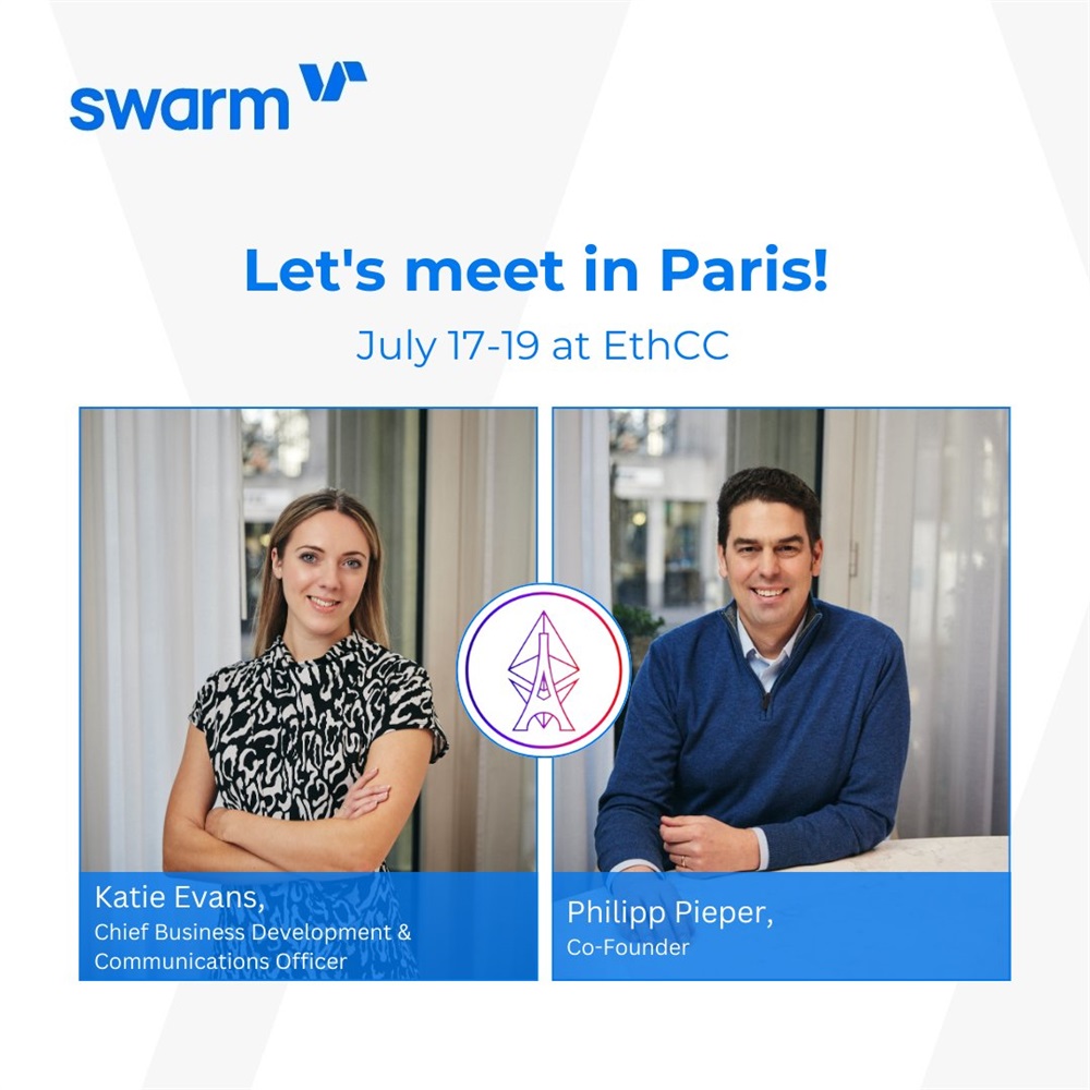 Are you going to #EthCC next week? Swarm co-founder Philipp Pieper & Chief BD and Comms Officer Katie. will be in Paris 17-19 July 2023.