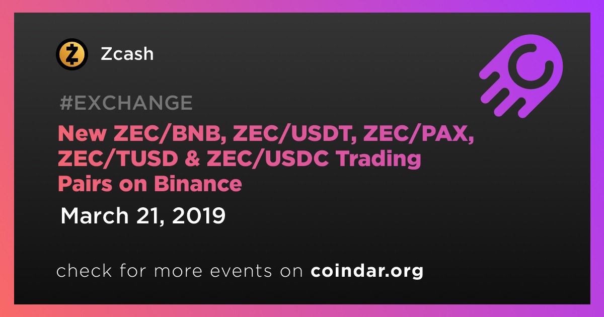 Binance will open trading for ZEC/BNB, ZEC/USDT, ZEC/PAX, ZEC/TUSD and ZEC/USDC trading pairs at 2019/03/21 4:00 AM (UTC).